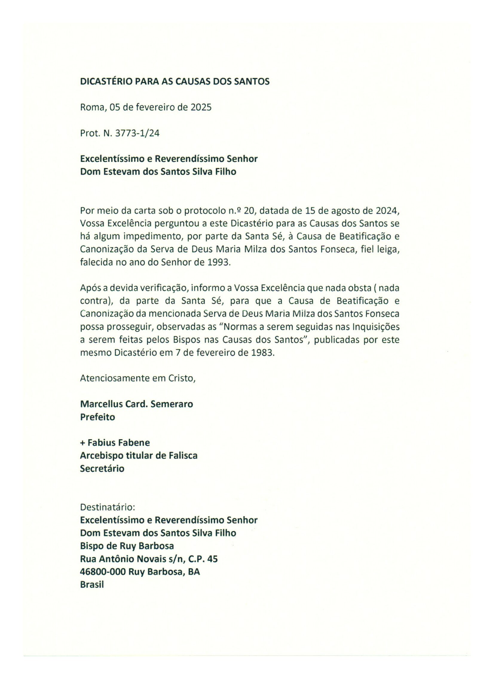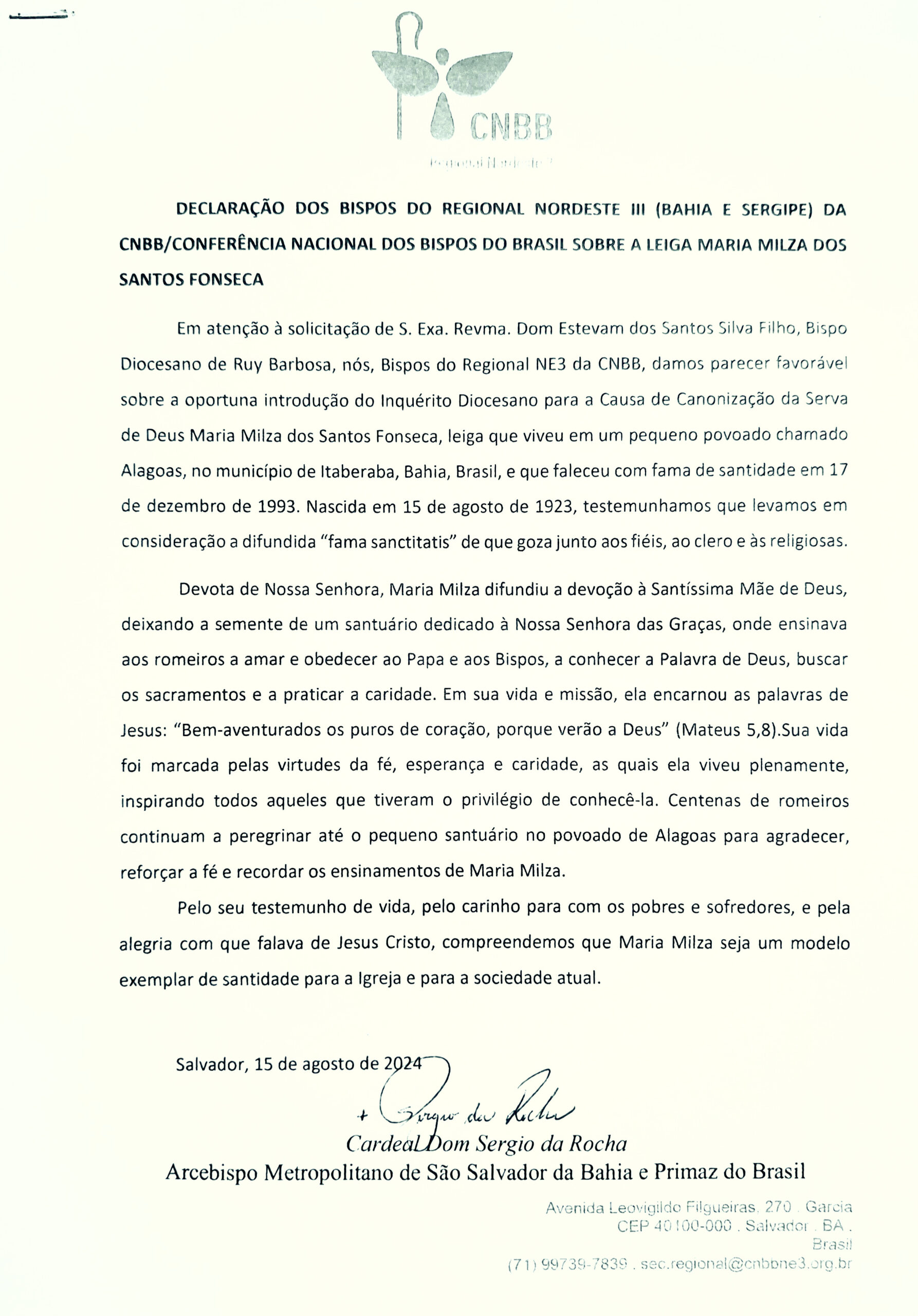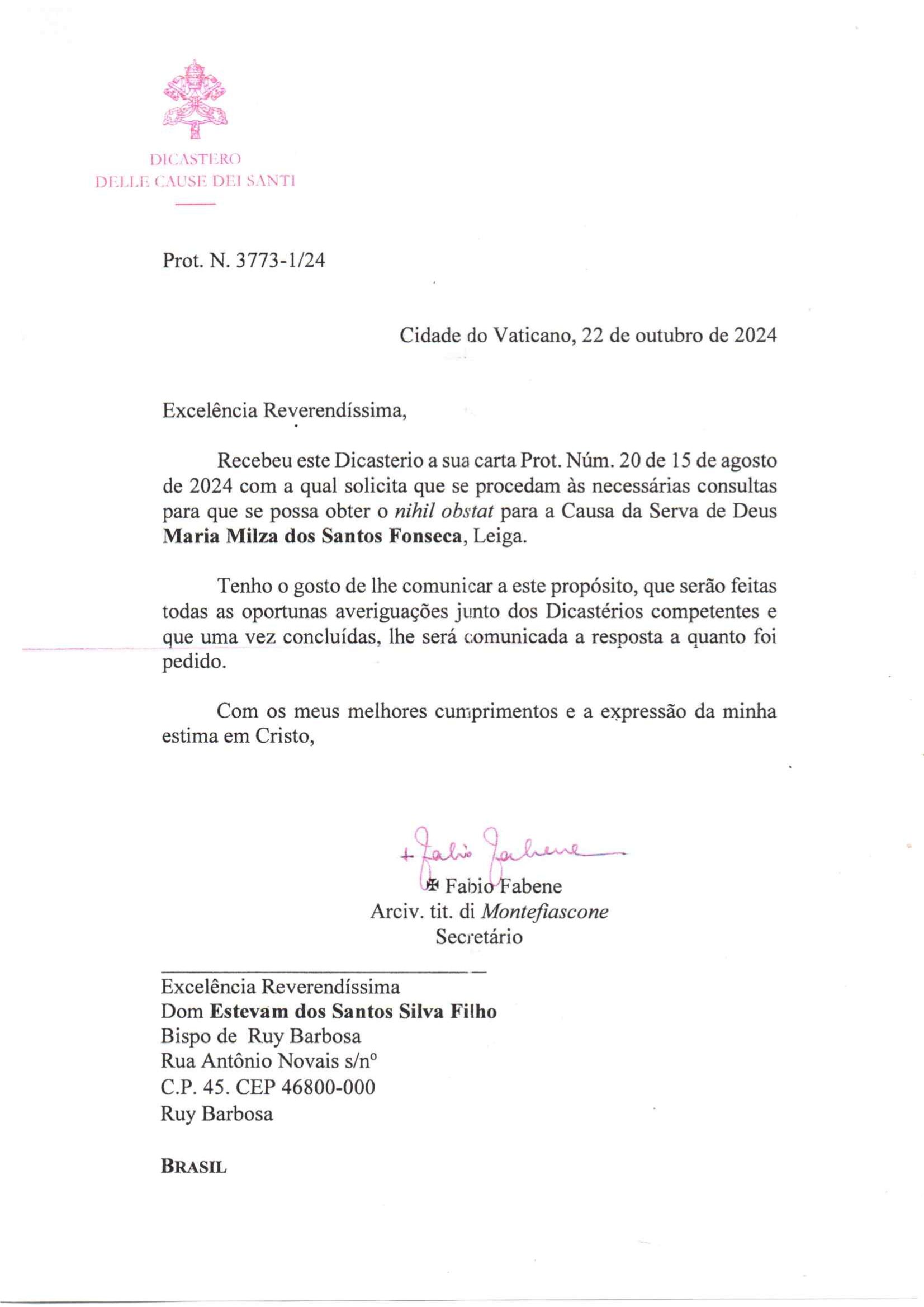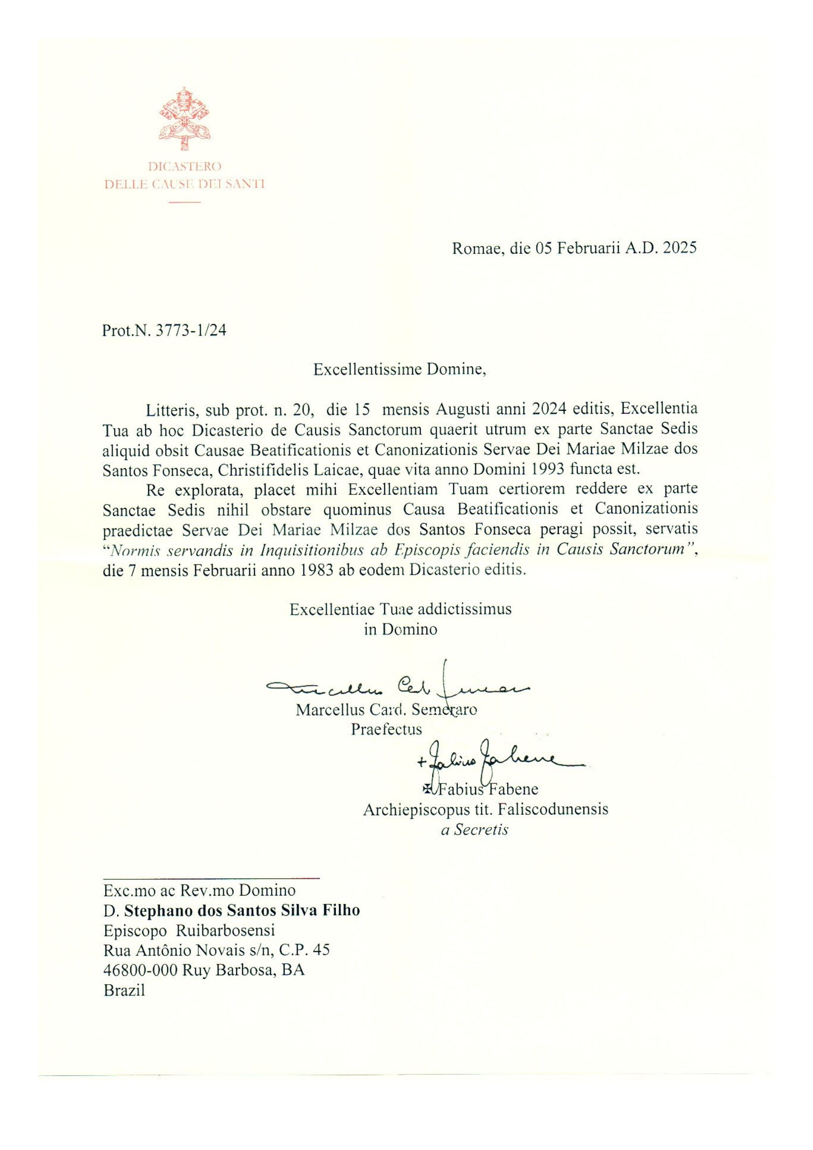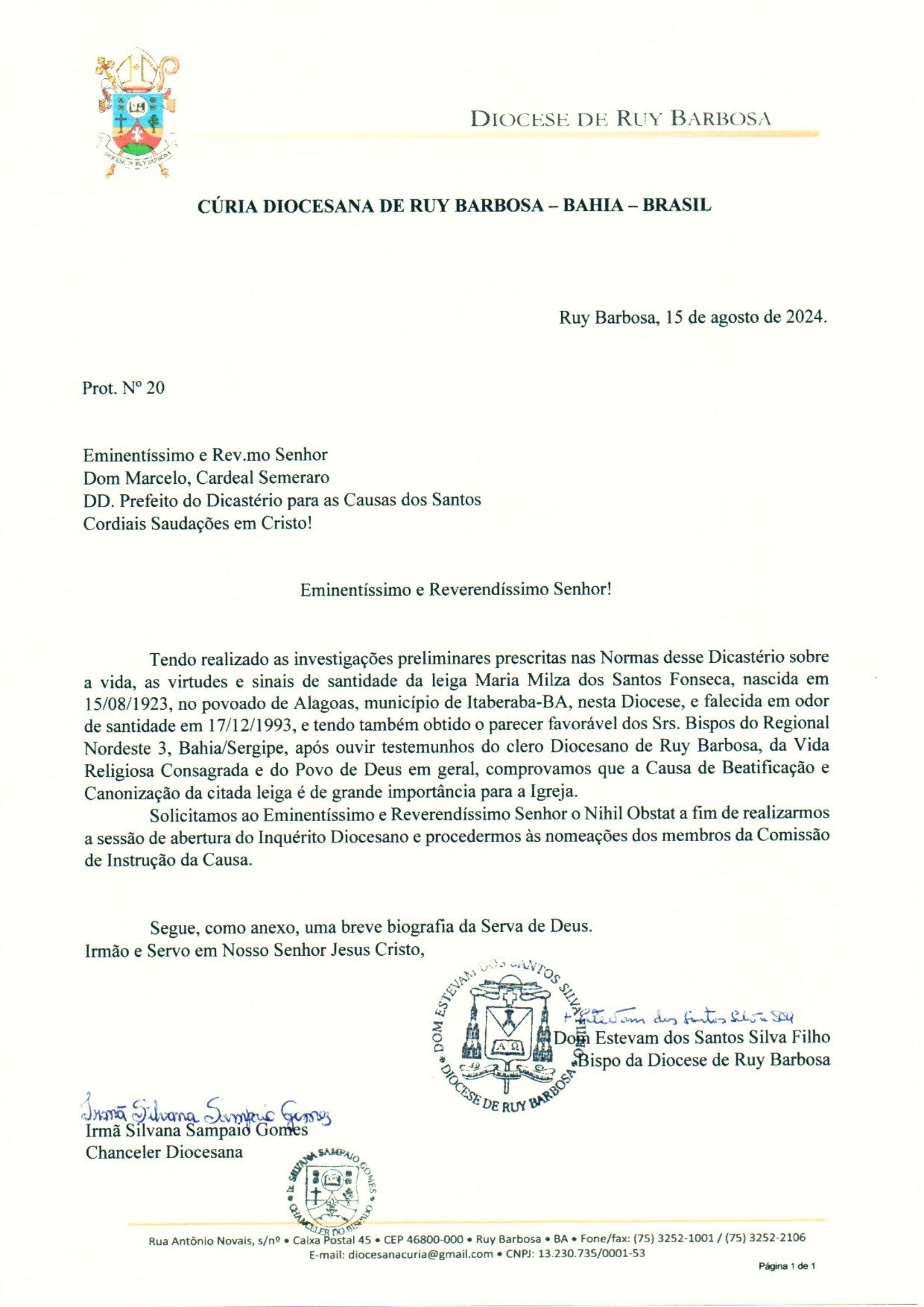 - 15 de agosto de 2024: A Diocese de Ruy Barbosa/BA, na pessoa de seu Bispo Diocesano, Dom Estevam dos Santos Silva Filho, assinou o pedido oficial de Nihil Obstat, enviado à Prefeitura do Dicastério para as Causas dos Santos. Juntamente com o pedido foi anexada a declaração dos bispos do Regional Nordeste III (Bahia e Sergipe) da CNBB/Conferência Nacional dos Bispos do Brasil, dando parecer favorável à solicitação.