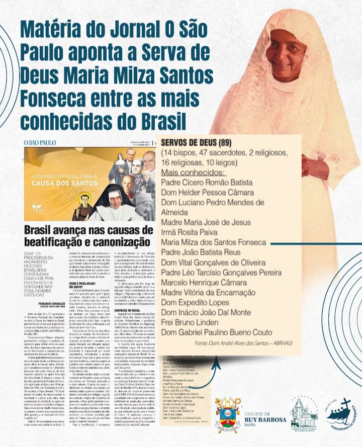 A matéria descreve o processo para o reconhecimento oficial da santidade de um católico cuja vida, morte e reputação indicam sinais evidentes de virtudes heroicas, martírio ou entrega total a Deus. Aqui na Diocese de Ruy Barbosa, no dia 15 de agosto, ocorrerá a abertura oficial para o Processo de Beatificação e Canonização da Serva de Deus Maria Milza, com a instalação do Tribunal Diocesano, dando início à fase diocesana do processo.